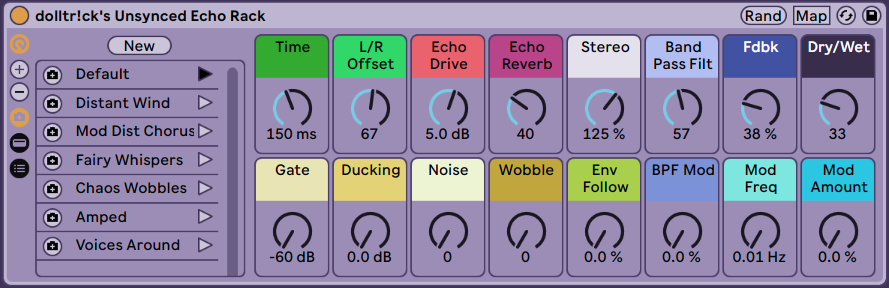 a rack for echoes that are freely timed / not synced to the tempo of projects, with custom-made snapshot presets ٩(◕‿◕)۶ drag and drop it onto a track in live, and commence knob-twisting for cool sounds!
